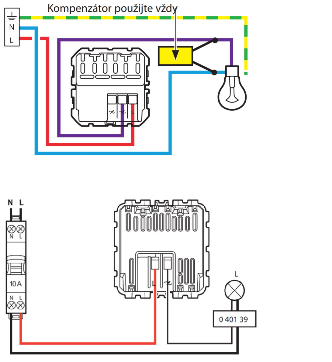 kompenzátor je odporúčané zapájať medzi N a spínanú fázu záťaže - viď.príloha - príkladové schémy.