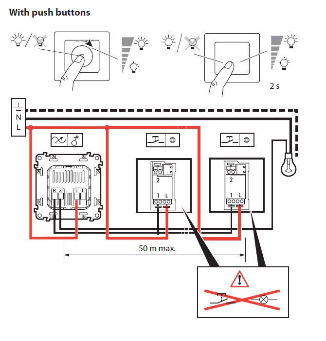 ak chcete ovládať rotačný stmievač z viacerých miest, musíte použiť tlačidlá ako vidíte na priloženej schéme zapojenia.